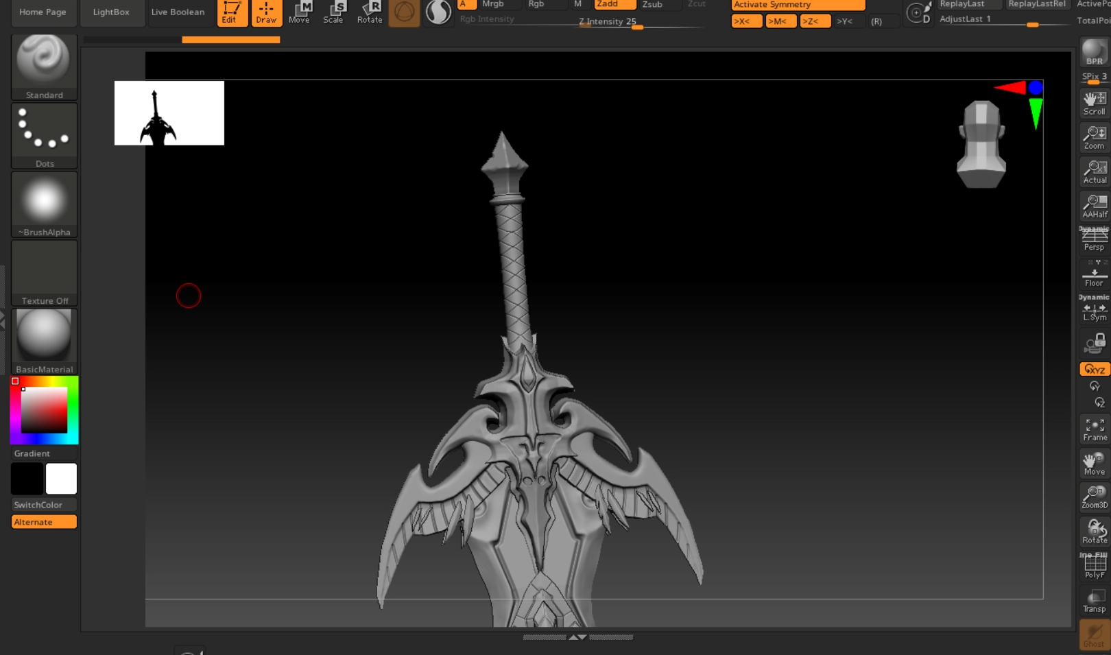 Base model built in Blender, with high-poly sculpting done in ZBrush for fine surface details and engravings.